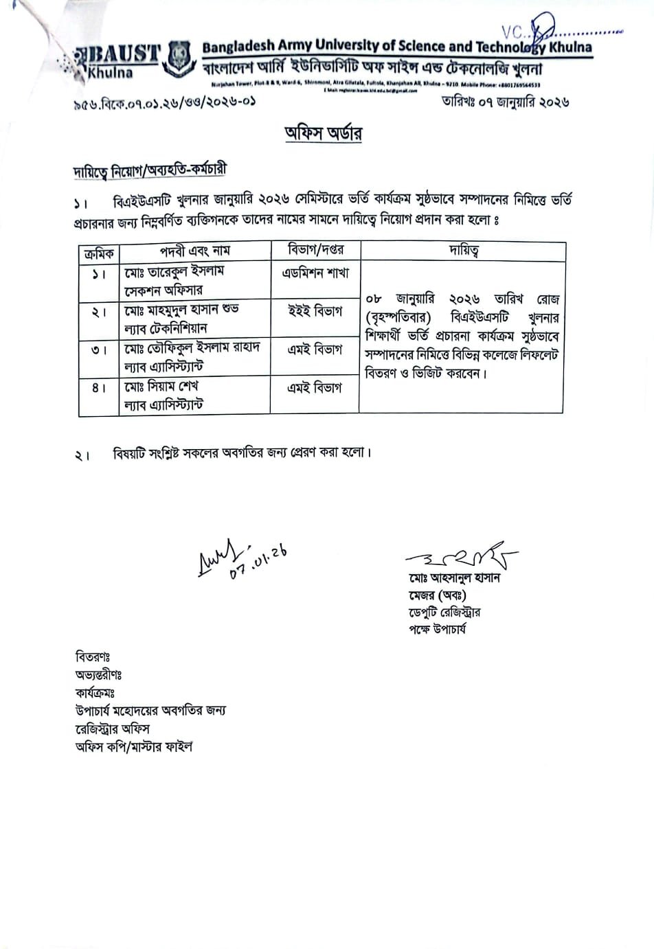 Office Order – দায়িত্বে নিয়োগ/অব্যহতি – কর্মচারী